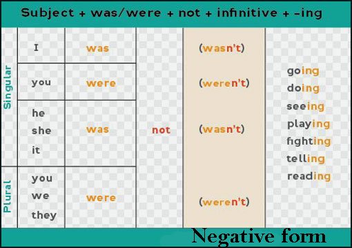Negative | Subject + (auxiliary verb) was/ were + not + present participle of main verb + ing + extension | Example: They were not studying their lessons. I was not riding alone. We were taking our lunch in the garden. |
